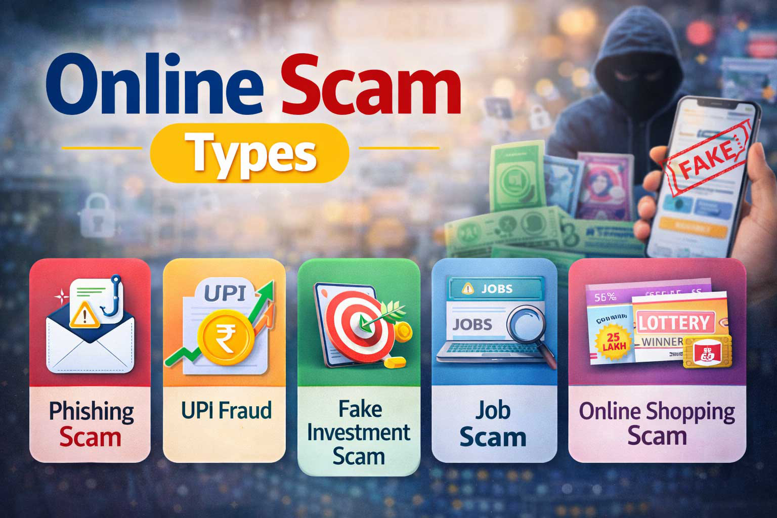 भारत में UPI, नेट बैंकिंग और मोबाइल ऐप के इस्तेमाल के कारण साइबर अपराधियों के लिए लोगों को निशाना बनाना आसान हो गया है। इसलिए यह समझना जरूरी है कि Online Scam Types क्या होते हैं, ये कैसे काम करते हैं और इनसे कैसे बचा जा सकता है।